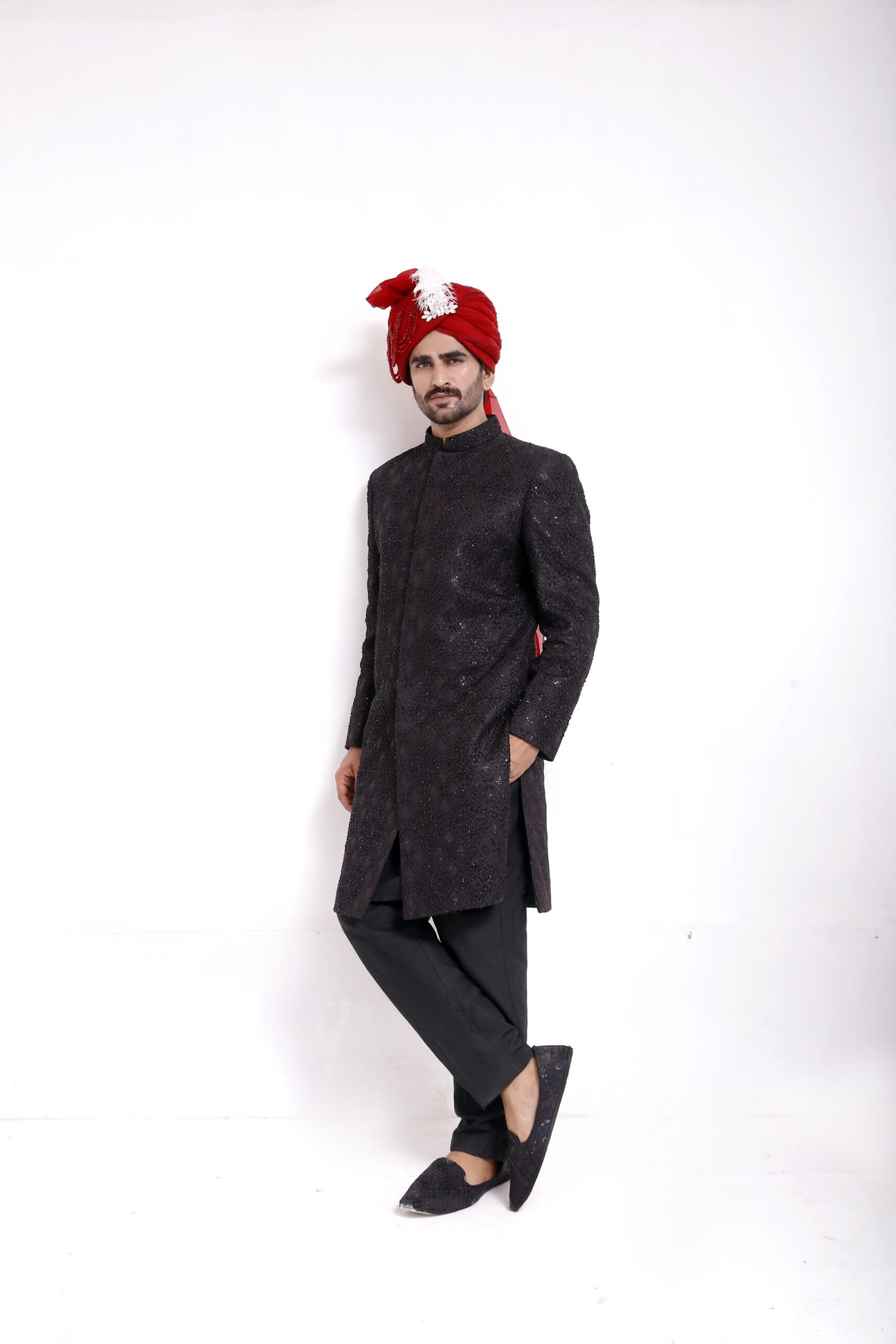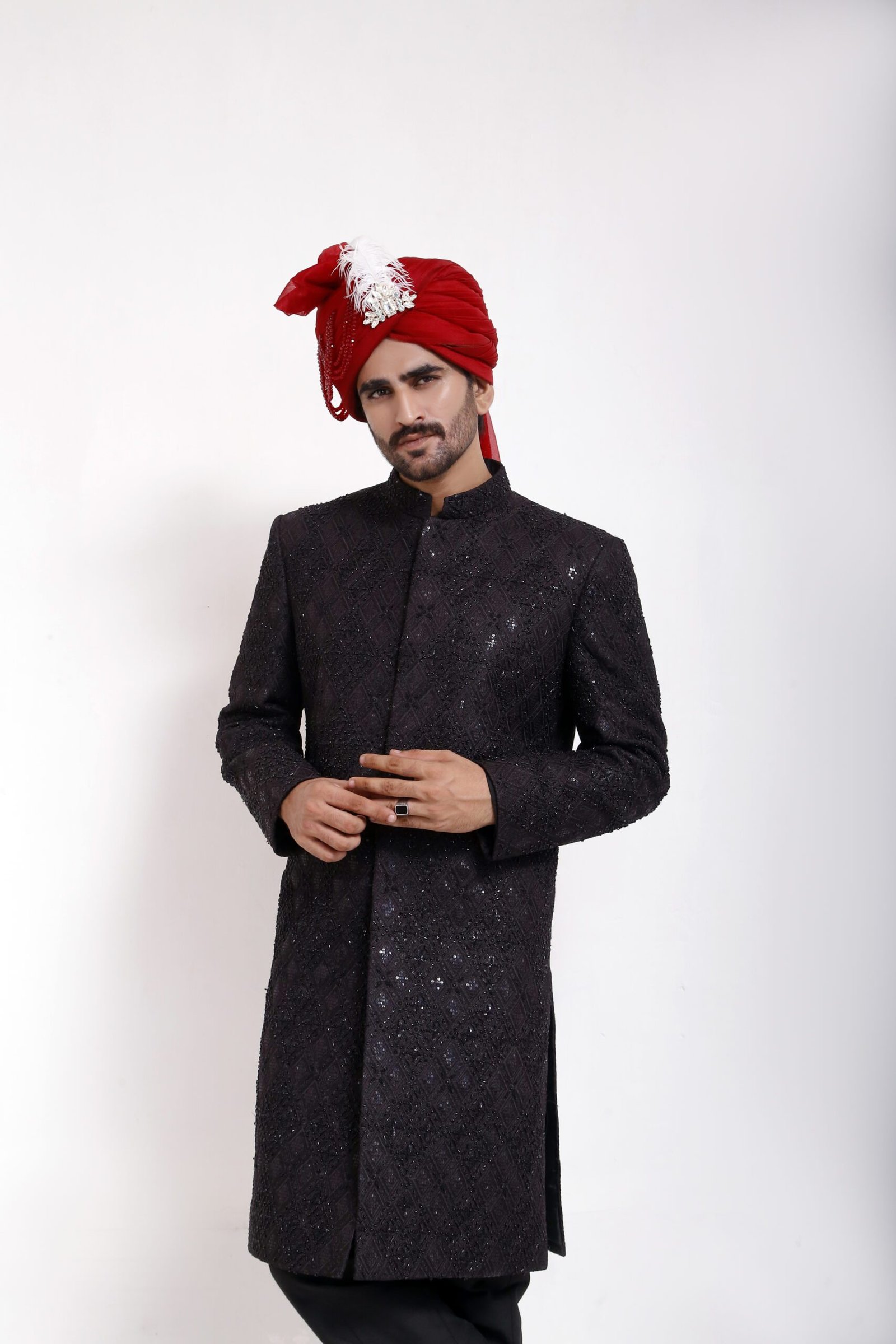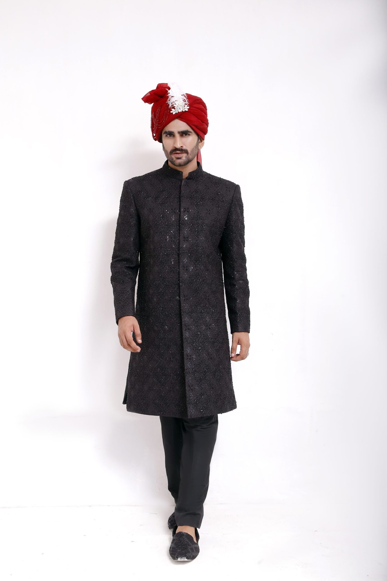 Crafted for timeless elegance, this sherwani is designed to make a refined statement on every special occasion. Made from premium-quality fabric, it offers a structured yet comfortable fit that drapes naturally on the body. The silhouette reflects classic South Asian tailoring, enhanced with subtle detailing that adds depth without overpowering the overall look.